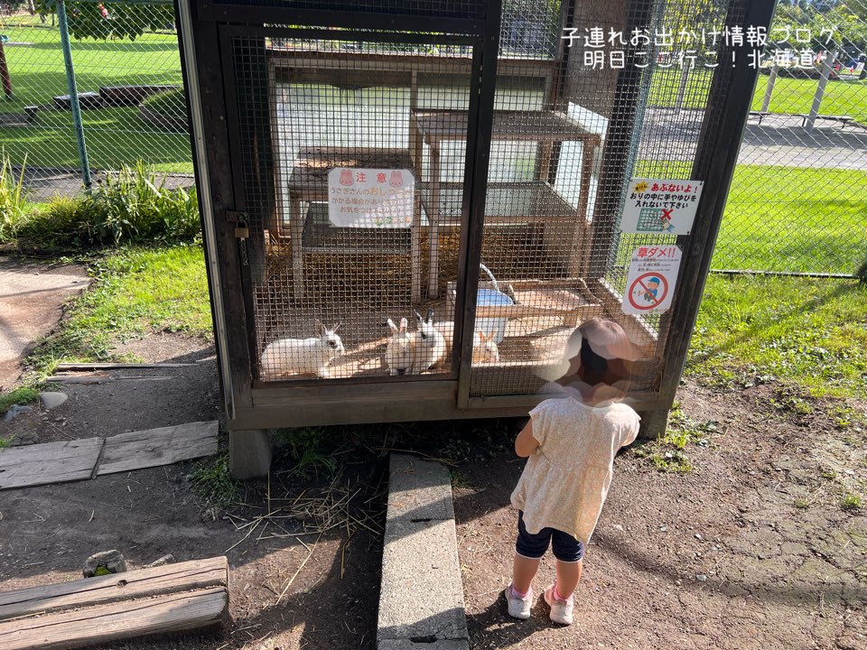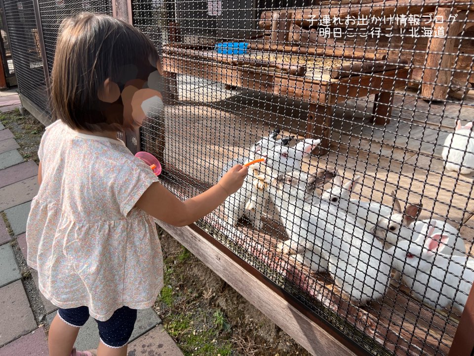 自分より大きな動物が怖い娘ちゃん、あいさつ程度にポニーやシカを見たら、大本命のウサギ小屋へ。