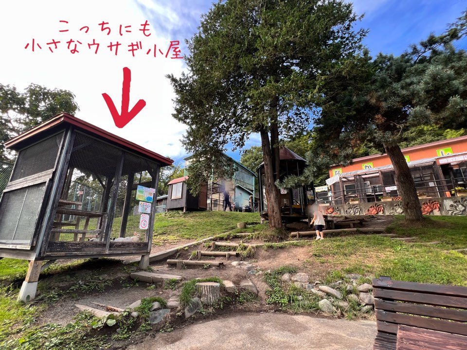 ウサギ小屋は大きな小屋と、もう一つ坂の下に小さな小屋があります。